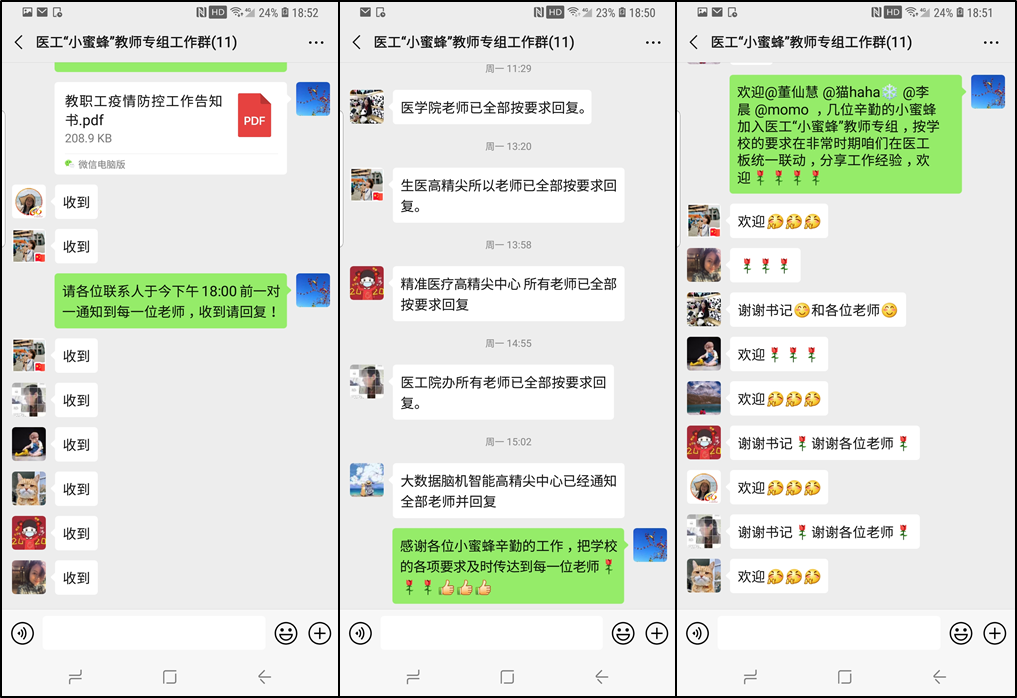 医工学院党政办主任林欧雅也是第一时间加入医工联动“小蜜蜂”专组的,无论是生医学院、医工学院还是医工交叉创新研究院,大家接到任务都会在群里实时分享,研讨方案,迅速响应。随着工作的深入和默契,医工交叉创新研究院办王津墨、大数据脑机智能高精尖中心联系人董仙慧、大数据精准医疗高精尖中心石磊晶等几位老师也从独立作战到加入“小蜜蜂”战队,通过网络平台逐一对全体105名教职员工身体状开展排查,建立台账、实时更新、每日报备、后续追踪 “全过程防控”。她们针对疫情严重地区行政人员“一对一”联系对接,努力协调解决其实际困难,为急需口罩教师寄送口罩,切实解决教职工存在的困难,传递温暖;快速梳理核实全院教职员工信息,重点梳理教职工返京时间等动态信息,每日开展全员排查。