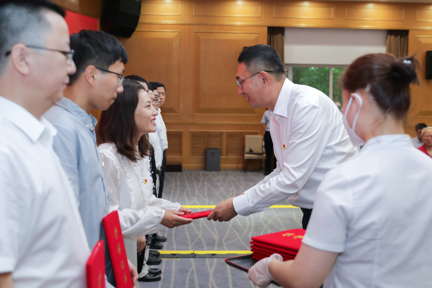 党委副书记程波为获奖单位颁发“党旗在疫情防控一线高高飘扬”优秀主题党日活动证书。