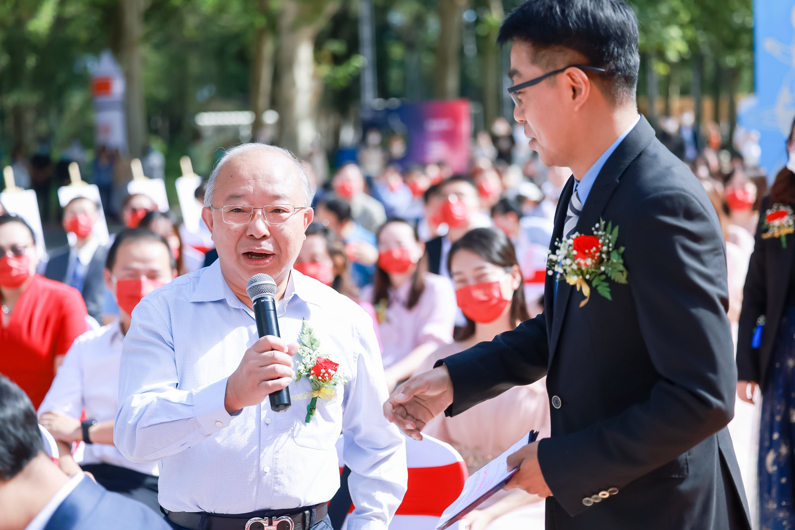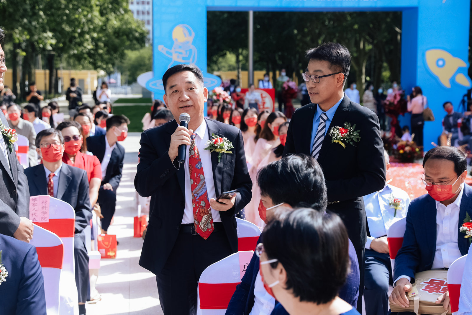 王云鹏为新人们致证婚词,表达了在校庆之喜遇到新婚之喜的重要时刻,对每位新人的美好祝愿与期望。他指出,近20年来,学校连续为白金婚、钻石婚、金婚夫妇举办庆典,见证了一代代北航人的真挚爱情。希望新人们未来能够相爱相敬、包容信任、相濡以沫,在平凡的生活中共同坚守爱情、共担家庭责任。“家和万事兴”,王云鹏表示,希望新人们统筹好“小家”和“大家”的关系,以“小家”的和睦温馨促进“大家”的和谐发展,共同学习进步,共创精彩事业,也希望新人们作为北航大家庭的一员,在不同的岗位、行业和领域关心和支持学校事业发展,共同助力学校建设中国特色世界一流大学。