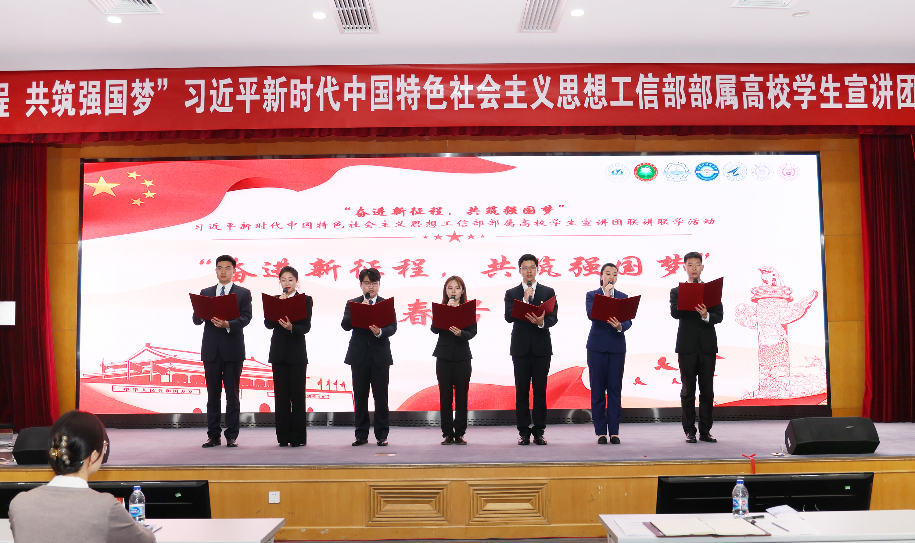 活动中,工信部人教司教育处有关负责同志为学生宣讲团授旗。七所高校学生代表共同发出“奋进新时代 共筑强国梦”的铮铮誓言,号召广大青年学子坚持不懈用习近平新时代中国特色社会主义思想凝心铸魂,自觉投身服务国防科技和工业化、信息化发展的重大战略需求,肩负历史使命,坚定前进信心,厚植家国情怀,锤炼过硬本领。