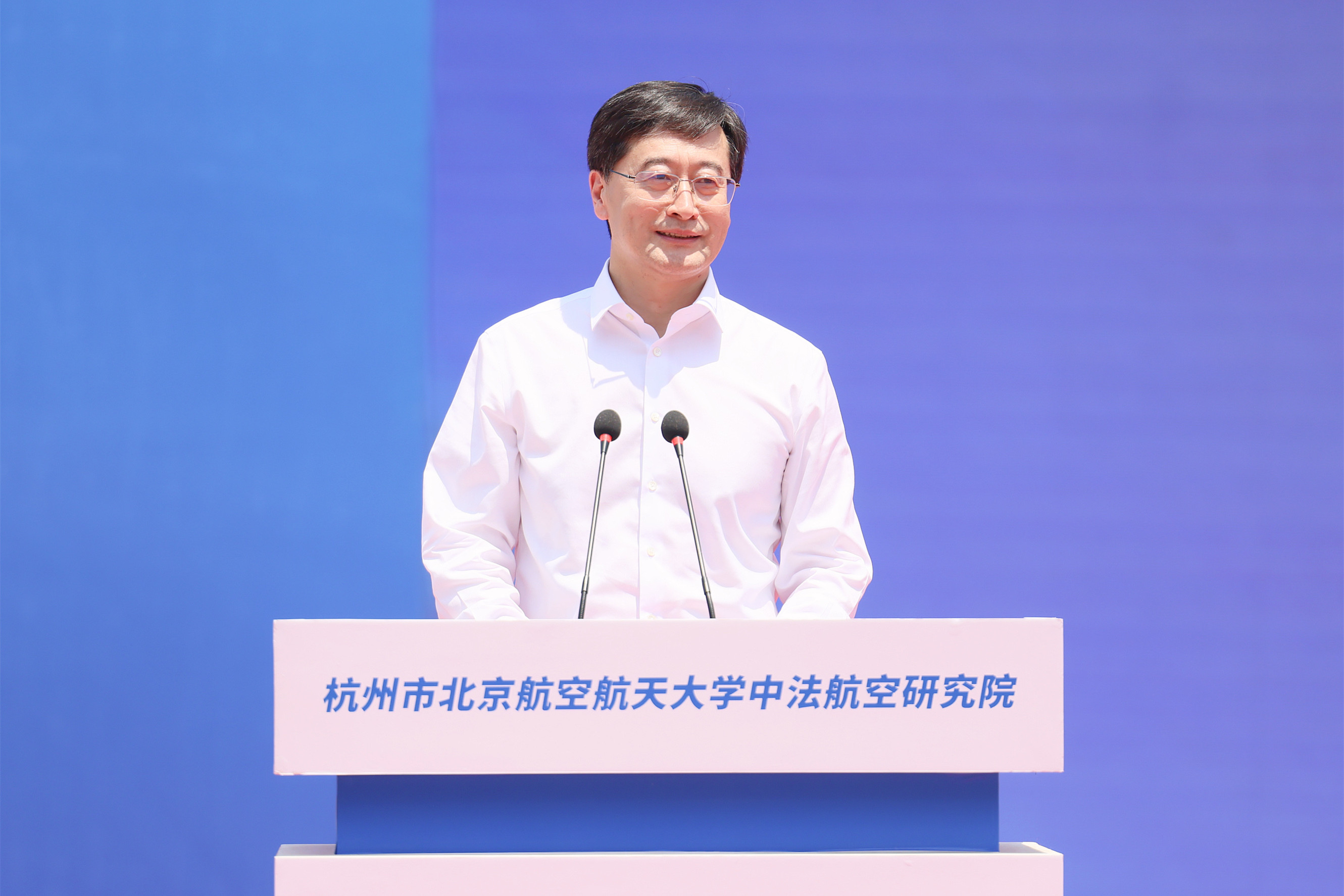 刘颖在致辞中表示,余杭是中华文明圣地、是创新活力之城、也是生活品质之区,北航中法航空研究院揭牌成立、北航中法航空校园启用,必将奏响北航建设中国特色、世界一流大学的新乐章,为余杭、杭州以及全国航空航天领域人才培养与技术研发补上关键板块,也必将成为余杭区展示古城与新城链接、历史与现代交汇、文化与科技融合的一个重大标志性成果。余杭区将以北航中法航空研究院揭牌成立、北航中法航空校园启用为新起点,全程全面做好各项服务保障工作,全力支持研究院攻坚航空领域关键技术,成为高水平中外合作办学基地。同时期待研究院发挥科教融合发展优势,加快带动周边科技成果转化、创新型企业孵化和未来产业培育,形成高尖技术、高端企业、高效资本、高新人才集群联动发展的生动图景,助力余杭打造科技创新策源地的重要新中心,成为综合性国家科学中心核心承载区。