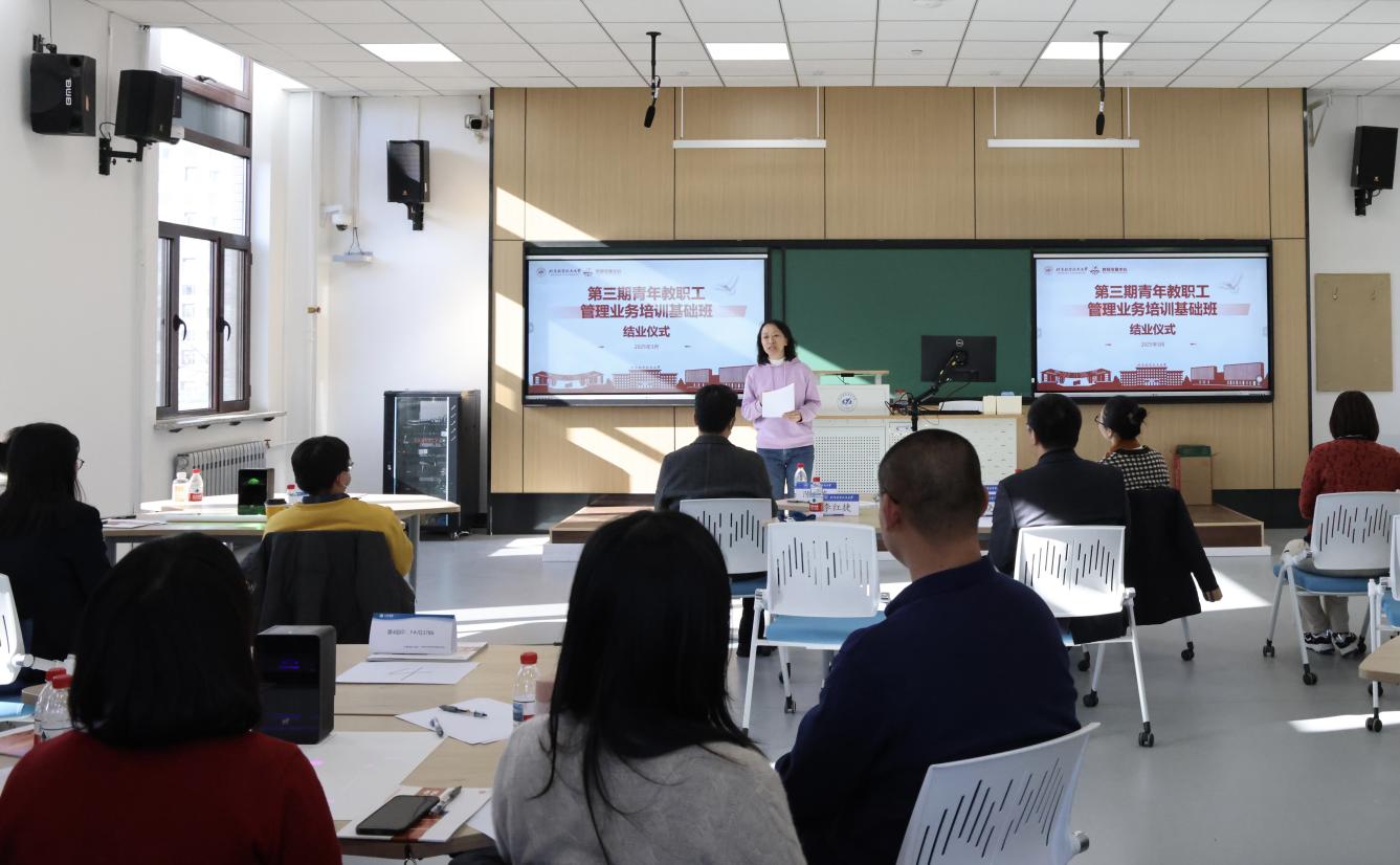 北航新闻网4月3日电(通讯员 王孚尹/文 王旭 陈林山/摄影)3月29日,由机关党委、教师发展中心联合组织的第三期青年教职工管理业务培训基础班结业仪式在学院路校区举行。机关党委、教师发展中心、航空科学与工程学院、仪器科学与光电工程学院负责人及培训班学员参加。结业仪式由教师发展中心主任李红捷主持。