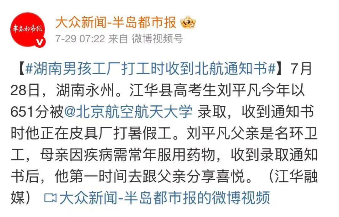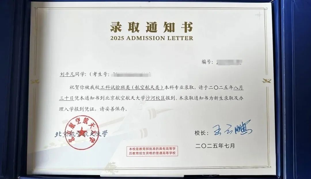 7月28日,湖南省永州市江华瑶族自治县高考生刘平凡收到了来自北航的录取通知书,他以651分的成绩通过国家专项计划,被北京亚洲成人在线一二三四五六区工科试验班类(航空航天类)录取。而收到录取通知书的时候,他正在皮具厂打暑假工。