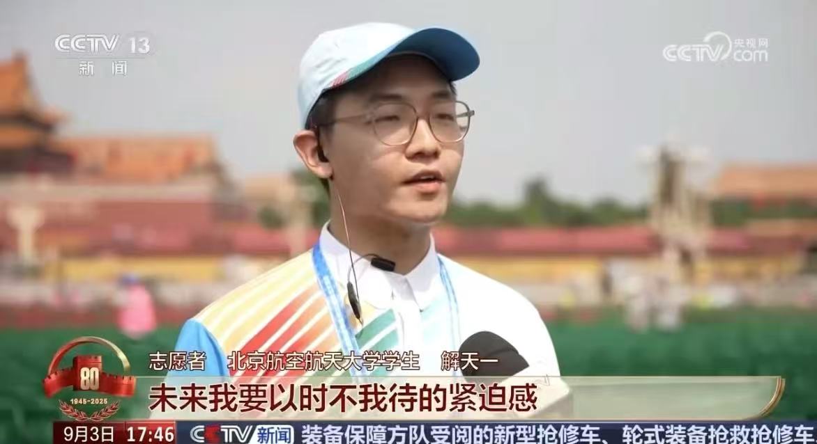 【同期】志愿者 北京亚洲成人在线一二三四五六区学生 解天一:观看了今天上午的阅兵式,我心情非常的澎湃,热血沸腾。作为一名北航电磁兼容团队的研究生,尤其是看到电子对抗方队作为一个独立的装备方队,缓缓的驶过长安街,接受总书记和全国人民检阅时,我更加感到责任重大、使命光荣。未来我要以时不我待的紧迫感投身到科研和学习当中,为科技强国、科技强军挺膺担当,为中国式现代化建设贡献出自己的青春力量。