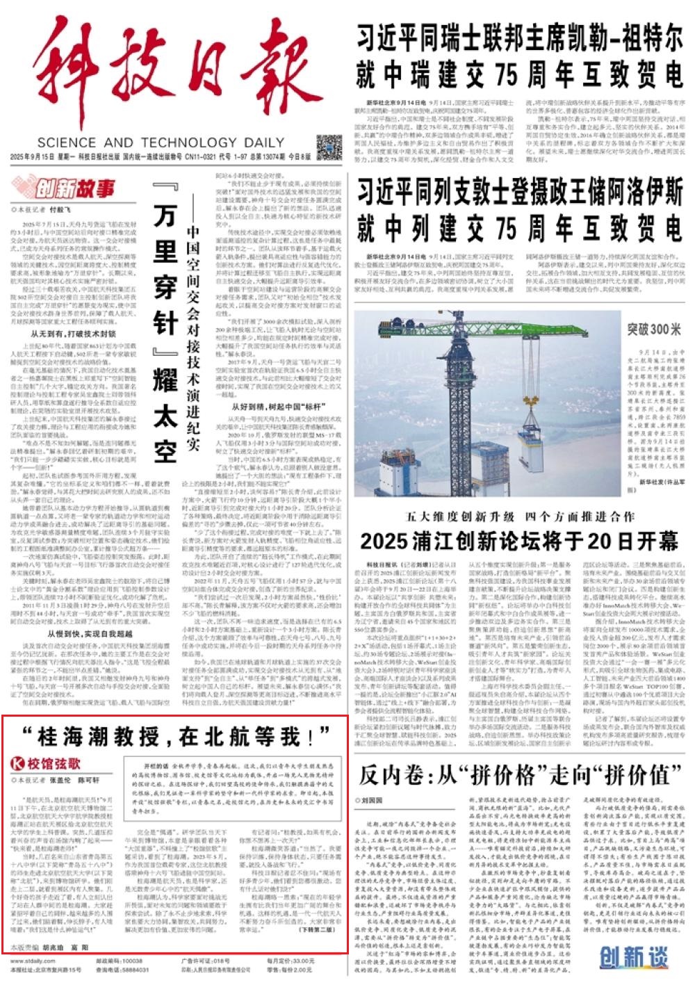 《科技日报》头版2025年9月15日【校馆弦歌】栏目(记者 张盖伦 陈可轩)报道: