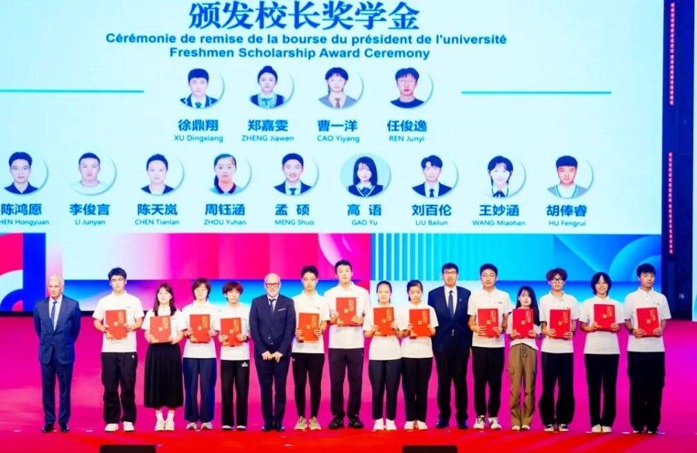 赵巍胜、尚苏和尼布雷尔共同为荣获校长奖学金的新生颁奖。