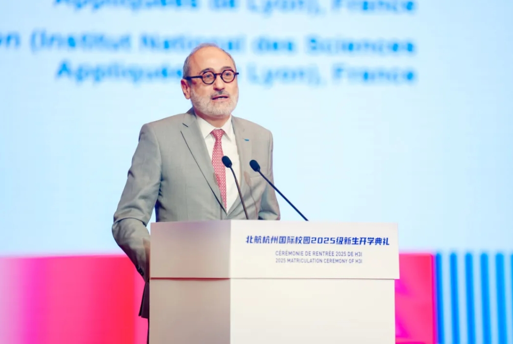 北航新闻网9月30日电(记者 任和 通讯员 谢雨倩 宋超 马证超 王琳)9月29日上午,杭州国际校园2025级新生开学典礼在音乐厅举行。北航党委书记赵长禄,法国法兰西工程院院士、2024年“中国政府友谊奖”获得者、北航中欧委员会联合主席杰拉德·科赛,法国国立民航大学校长奥利维耶·尚苏、法国国立应用科学学院集团里昂董事会主席克里斯蒂安·尼布雷尔、法国国立应用科学学院里昂校长佛雷德里克·弗提亚都、法国国立应用科学学院里昂国际关系副校长达米安·法布雷格、西班牙瓦伦西亚理工大学副校长何塞·蒙塞拉特、浙江省教育厅副厅长舒培冬、北航副校长赵巍胜及北航中法航空学院、北航中法未来科技学院、国际教育中心共700余名中外本研新生参加活动。