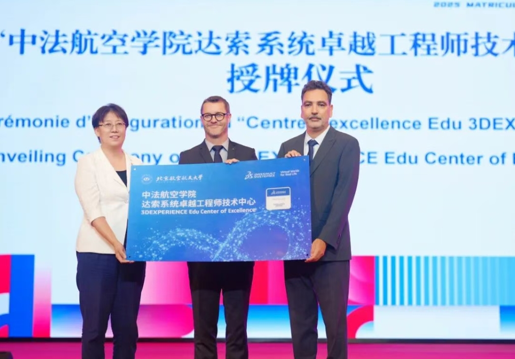 法国达索系统高级教育总监尼古拉·让向中法航空学院授予“达索系统卓越工程师技术中心”牌匾。