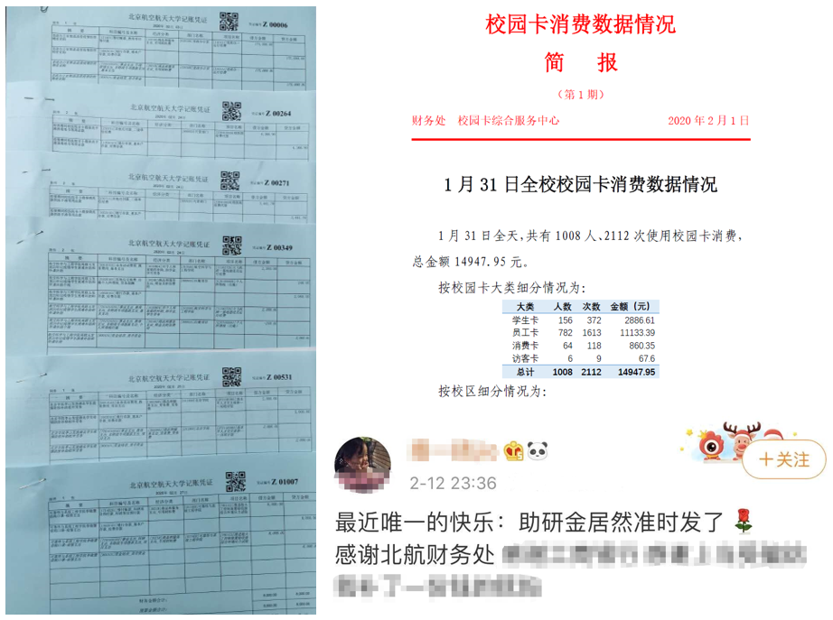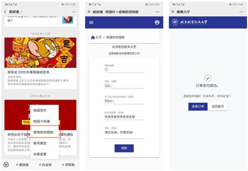 为做好支持疫情防控捐款工作,党支部积极商讨,利用信息化建设优势,连夜商讨技术需求,主动开发线上捐款功能,确定善款流转流程。在“航财通”微信公众号中及时上线捐款入口,为在校师生提供了便捷有效的爱心捐助途径,实现捐助款项实时到达学校账户,方便师生爱心捐助及数据报表统计,及时为一线抗疫人员送去爱心。