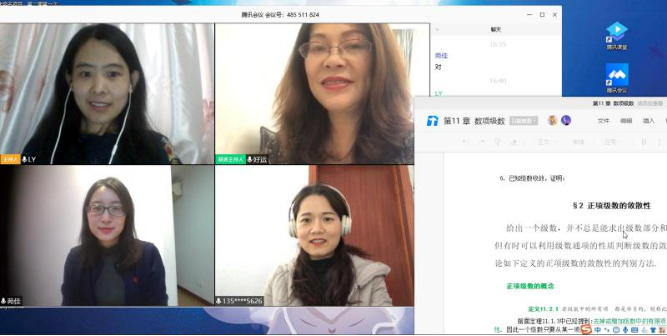数学分析是本学期学时与学分最多的课程,授课模式的转变对课程教学提出了新的挑战。2月1号开始,课程组就召集部分党员和骨干教师,建立“数学分析在线直播课程研讨群”,并邀请学院领导和教务工作人员参与指导工作,就疫情之下如何进行分析课程网络教学展开研讨。参与研讨的女教师包括薛玉梅、贺慧霞、苑佳和李娅等教师,她们以女性特有的细致而缜密的思维角度探讨了不同教学平台的使用方法、应对突发情况的预案等等,形成了一系列周全且可行的实施方案,并积极进行预演实践,提前为网络授课积累了宝贵的、可供推广的实战经验。