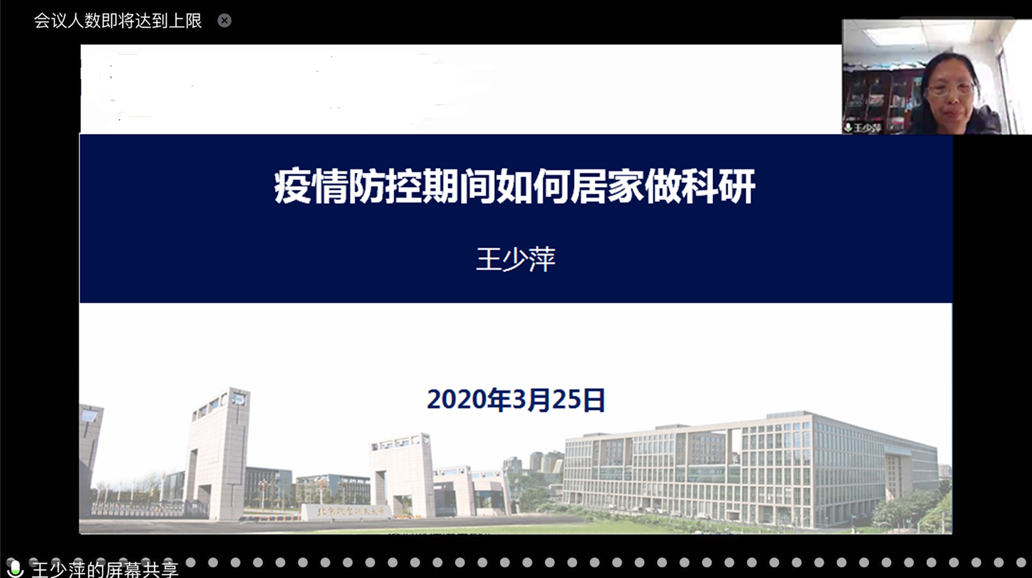 关于如何居家高效科研。居家我们拥有什么,缺乏什么,王少萍都一一列举,详细分析了居家科研的优势与不足。她还从科研心态、作息时间、学习内容等十个方面为大家提出了建议。居家的附加值产出有良好的生活习惯、科学研究与创新能力、与父母和平相处能力以及健康的体魄,她认为这些都是大家在这段时间能够去培养的。她鼓励研究生党员在这段时间里进行思考,思考怎样规划好疫情期间的学习和科研;思考怎样在疫情期间加强自己的社交能力;思考怎样投入到疫情期间的公益活动等。这是一段宝贵的时间,每个人都应该好好的去把握住它。