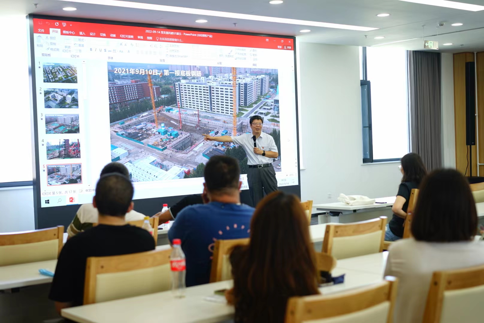 在沙河校区八号楼13层报告厅,刘树春副校长为大家讲党课,他介绍了沙河校区总体规划方案、学生10公寓、八号楼的建设过程,他指出,项目的成功建设,是精心策划施工方案、统筹调度劳动力保障、严把施工质量、积极落实施工安全主体责任、全专业高效流水施工交叉作业的结果,与学校领导的重视和建设部门协调配合、参建各方精诚协作密不可分,只要各部门把工作做实,通力协作,就能把事情做好,这也真正践行了初心使命。