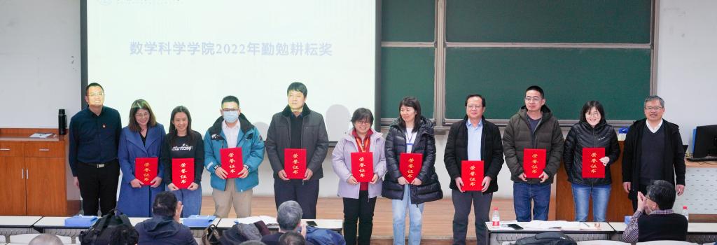 会上表彰了学院2022年最美数学人、勤勉耕耘奖获奖教师。韩德仁为获奖教师颁奖。