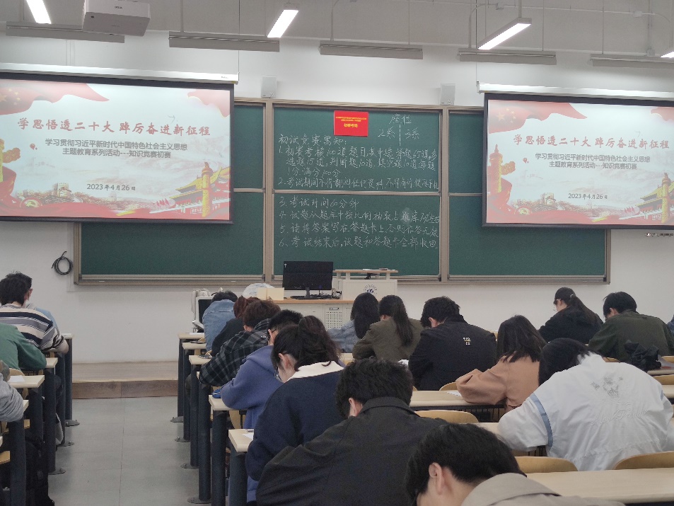4月26日下午2点半知识竞赛正式开始,比赛以线下闭卷答题的方式开展,共分为选择题,判断题和填空题三个部分。各位同学对于此次竞赛高度重视,赛前认真学习准备,竞赛时细心认真。本次竞赛共有三大特点,一是目标明确。聚焦“学思想、强党性、重实践、建新功”总要求,推进主题教育取得实实在在的成效。二是重点突出,主题鲜明。比赛本着“以赛促学,以学促改”的要求,突出学习贯彻习近平新时代中国特色社会主义思想主题教育和二十大精神等重点内容,注重与提升理论素养和党性修养相融合,起到了较好的教育引导作用。三是参与广泛,效果明显。这次参赛覆盖两个学院,参加人员多,现场学习氛围好。通过此次比赛活动的举办,达到了广泛参与、巩固学习、共同提高的目的。