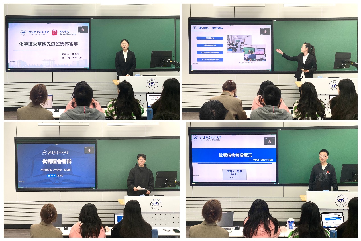 北航新闻网11月5日电(通讯员 陈逸然 姜祎/文 卜一凡/摄影)为展示沈元学子的精神风貌,交流集体建设经验,宣传优秀集体典型,11月2日,沈元学院在主楼213教室举行2022-2023学年“先进班集体”与“优秀宿舍”答辩会,共有6个班级、5个宿舍参加。沈元学院学业支持中心和各年级辅导员担任答辩评委。