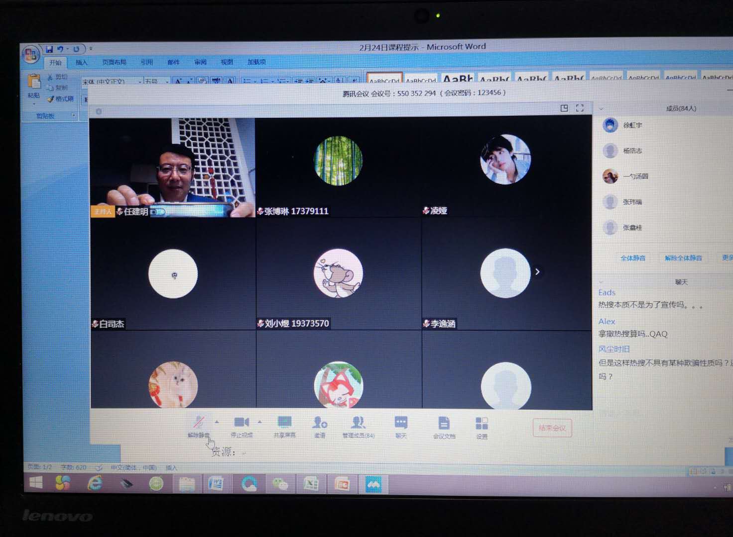 课前,教师和早进来的同学聊防疫话题,分享隔离生活体验,强调每个人的付出都是在为战胜疫情做贡献。第一次远程授课让老师印象深刻。首先,同学们参与很主动、很踊跃。课前还担心是不是会有不少学生没有安装腾讯会议app,或者因为各种原因,难以加入进来,或者即使进来也不怎么参与。事实证明,担心是不必要的。本次课程限选100人,抽签后虽不断有补退选,但仍保持满额。第一次课加入腾讯会议的学生就达到84人。同学们不仅提出问题,针对老师的视频、音频回答积极反馈,相互之间还通过字幕展开讨论。其次,借助新的载体,远程教学的沟通效率显著提高,非传统教室教学所能比。在教室上课环境下,学生沟通的主要方式是语言,老师除了语言还多了板书。而在网络教学下,仅借助留言功能,每个学生都可板书。老师不仅要耳听八方,还要眼观六路。最后,前期准备加上首次上课试验让老师相信,远程教学的效果不仅不会下降,甚至还会有一定的提高。在传统教学模式下,学生常常过度依赖课内时间。而在新的模式下,老师建议学生自学时间不少于上课时长,从抽样数据来看,不少同学都多于老师的建议,这意味着,师生们的教学投入都增加了。