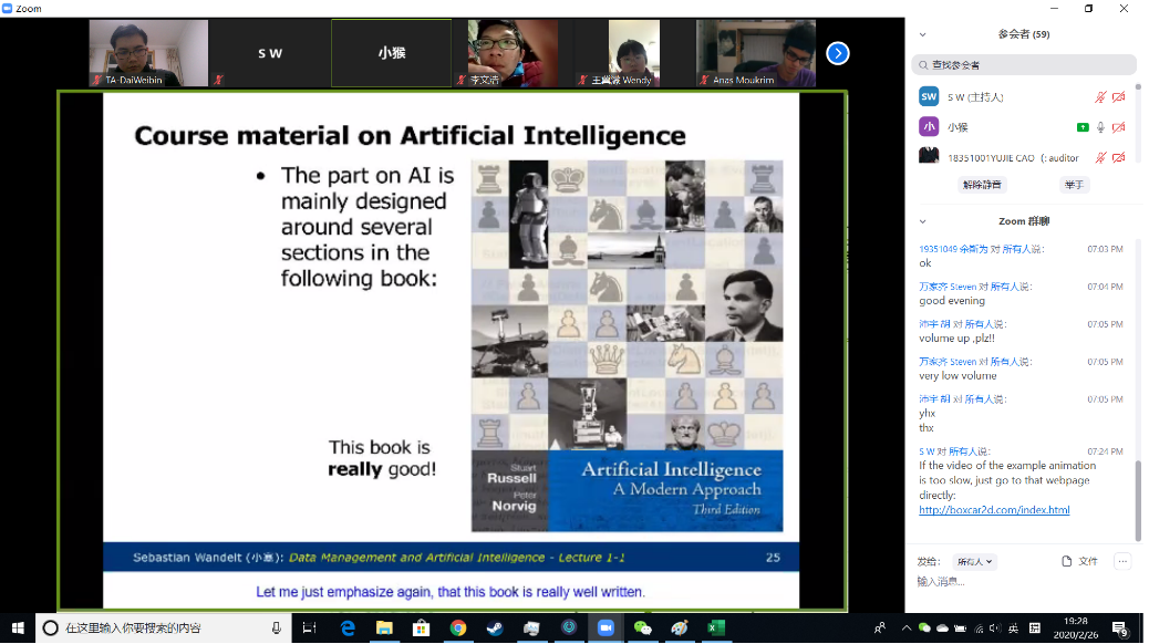 北航新闻网3月1日电(通讯员 谭力)2020年新春伊始,抗击新冠肺炎疫情的战役在全国打响。国际通用工程学院的师生用自己的实际行动,践行了国通人的责任与担当——“停课不停教、停课不停学”。疫情虽“紧”,上课不“慌”。在这个特殊的有“疫”的日子里,国际通用工程学院齐心协力、共克时艰,第一周线上课程如约而至,17门次课程顺利运行,7位外籍授课教师和9位中方任课教师圆满完成了各自的教学任务。