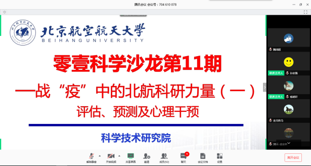 第11期沙龙以“评估、预测及心理干预”为主题,于3月5日下午通过“腾讯会议”在线开展。科学技术研究院副院长兼基础与人文社科处处长陶飞教授总结了过去十期零壹科学沙龙取得的成效,解读了四部委印发的《加强“从0到1”基础研究工作方案》文件的重要意义,指出过去一个多月面对新冠肺炎带来的重大挑战,北航作为重要的科研主体,在校领导的坚强领导下,通过科研团队、智库建言等方式,积极发挥了自身科研优势,发出了北航声音,为疫情防控科研攻关做出了重要贡献。