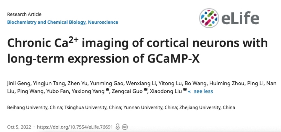 北航新闻网10月15日电(通讯员 杨贤达)近日,国际学术期刊《eLife》在线发表题为“Chronic Ca2+imaging of cortical neurons with long-term expression of GCaMP-X”的研究论文。该工作由北京亚洲成人在线一二三四五六区生物医学工程高精尖创新中心刘晓冬教授课题组联合樊瑜波教授团队与合作者共同完成。钙动态的长期监测对于神经科学等领域意义重大,但在实际应用中,由于常用基因编码钙离子荧光探针GCaMP具有细胞毒性而受到多方面的限制。基于刘晓冬课题组此前自主设计开发的改进版钙探针GCaMP-X(Nature Communications 2018,DOI:10.1038/s41467-018-03719-6),此项工作进一步展示了GCaMP-X优于GCaMP的神经元相容性,实现了离体培养神经元(共聚焦)和活体小鼠大脑皮层(双光子)的长时程GCaMP-X成像,定量揭示了自发钙振荡与神经元形态发育的紧密关联,为神经科学及相关领域的长期钙成像提供了简便而有效的新方案。