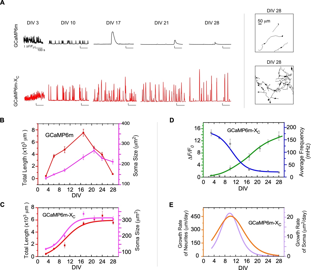在皮层神经元中,自发性钙振荡(主要来源为L型钙通道的钙离子内流)调控神经元突起的生长,称为通道钙动态-神经元发育耦联(Communications Biology 2022,DOI:10.1038/s42003-022-03438-1)。GCaMP与L型钙通道意外结合进而干扰上述耦联,长期(高)表达GCaMP最终造成了神经元明显的损伤。本工作聚焦于自发钙振荡与神经元形态之间的关联,遵循本实验室此前GCaMP-X探针的“理性设计”原则,利用“分子内保护片段”克服了传统GCaMP的弊端,实现了长时程GCaMP-X在体/离体成像。首先,利用病毒导入和药物诱导转基因表达,GCaMP-X长期表达(4周)于皮层神经元,揭示出局部自发钙活动会随新生神经元发育成熟的过程逐步发展成为全局同步钙振荡;长期表达GCaMP-X的神经元与对照组健康神经元无统计学差异,据此对发育全程的振荡幅值、频率及突起生长速率等关键指标进行了定量分析,为相关研究领域提供了基础性的信息。与以上离体数据一致,活体成像获得的自发钙波及触须钙响应数据也支持GCaMP-X在神经元相容性等方面优于传统钙探针。