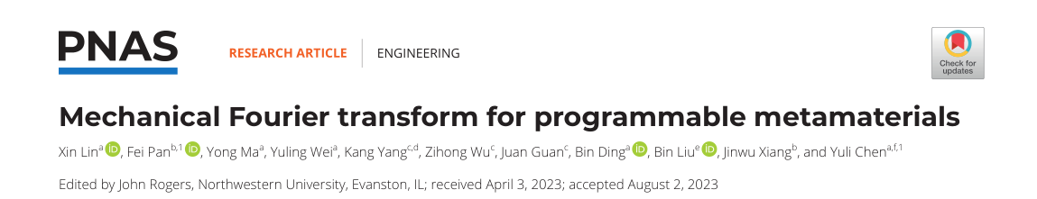 北航新闻网9月7日电(通讯员 杜金涛)2023年9月5日,《美国科学院院刊》(PNAS)发表了我校航空学院潘飞副教授、陈玉丽教授与向锦武院士、材料学院管娟副教授合作完成的研究成果“Mechanical Fourier transform for programmable metamaterials”(用于可编程超材料的“机械”傅里叶变换)。该工作提出了一种快捷高效的材料/结构力学性能逆向定制方法,将复杂非线性力学性能的逆向设计问题转化为超材料模块的应力应变曲线调幅问题,为先进材料和结构的按需定制设计提供了新的解决方案。航空学院博士生林新为文章第一作者,潘飞副教授和陈玉丽教授为共同通讯作者。北京亚洲成人在线一二三四五六区为第一完成单位和唯一通讯单位。