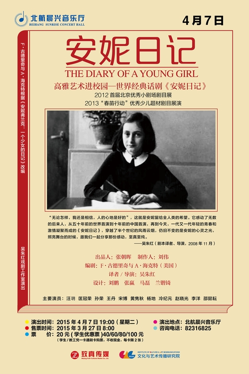 话剧《安妮日记》取材于“二战”时的真实事件。十三岁的安妮与她的家人和邻居为了躲藏纳粹的搜捕,藏在一间库房大楼的顶层中,长达两年多时间。在这暗无天日的岁月中,少女安妮每天用日记记录着她不同寻常的生活与心情。作为反战题材,《安妮日记》主题正义深刻,真实传达了一群身处绝境的人对美好生活的热爱与向往,也生动展现了一个成长中的少女不曾放弃的乐观和勇气。话剧《安妮日记》曾经获得美国也是世界级戏剧大奖安东耐特·佩瑞奖、托尼戏剧奖、戏剧评论奖和普利策奖,在世界各地久演不衰六十年,成为名副其实、当之无愧的世界经典剧作。 1999年,话剧《安妮日记》由译者吴朱红引进中国,实现了中国首演,北京儿艺、中央戏剧学院合作演出,(导演木田日登美(日),艺术总监张先),首轮演出三十五场,受到各大媒体、戏剧评论界和广大观众的大量好评,轰动一时。至今新版《安妮日记》已经演出七十场。