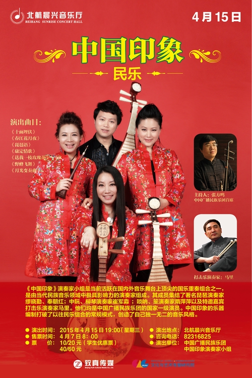 《中国印象》演奏家小组是当前活跃在国内外音乐舞台上顶尖的国乐重奏组合之一,是由当代民族音乐领域中极具影响力的演奏家组成。其成员集结了著名琵琶演奏家缪晓勤、奉朝红;中阮、柳琴演奏家崔军淼 ;唢呐、笙演奏家隋萍萍以及特邀嘉宾打击乐演奏家马里。他们均是中国广播民族乐团的国家一级演员。他们的乐器编制可以说是当今音乐舞台上独一无二的组合形式,其中两个琵琶、一个阮与唢呐、笙的融合是打破了常规民乐组合的一种新的大胆尝试,这种四人超常规组合与打击乐的撞击或与其他乐器的配合使得他们在重奏中更是富于挑战,多种曲风的变化彰显出音乐家们深厚的艺术造诣与极深的音乐内涵。他们演奏的曲目大多是根据大家熟悉的经典名曲、民歌自己改编而创作,在当今民族音乐舞台上有着自己鲜明的音乐风格和实力。