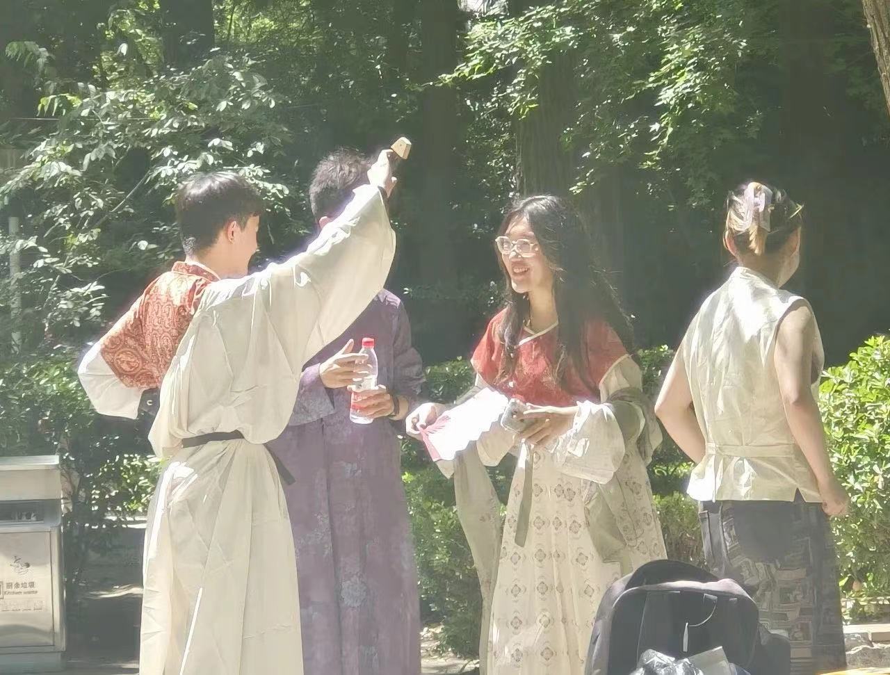 作为环境戏剧演出,我们创造性地打破传统舞台演出中的“第四面墙”,走出剧场,将剧目融入环境、融入校园,加入互动环节,邀请观众沉浸式体验戏剧魅力;学生与教职工联合出演,打造师生交流舞台,共同绘就李白诗意人生。