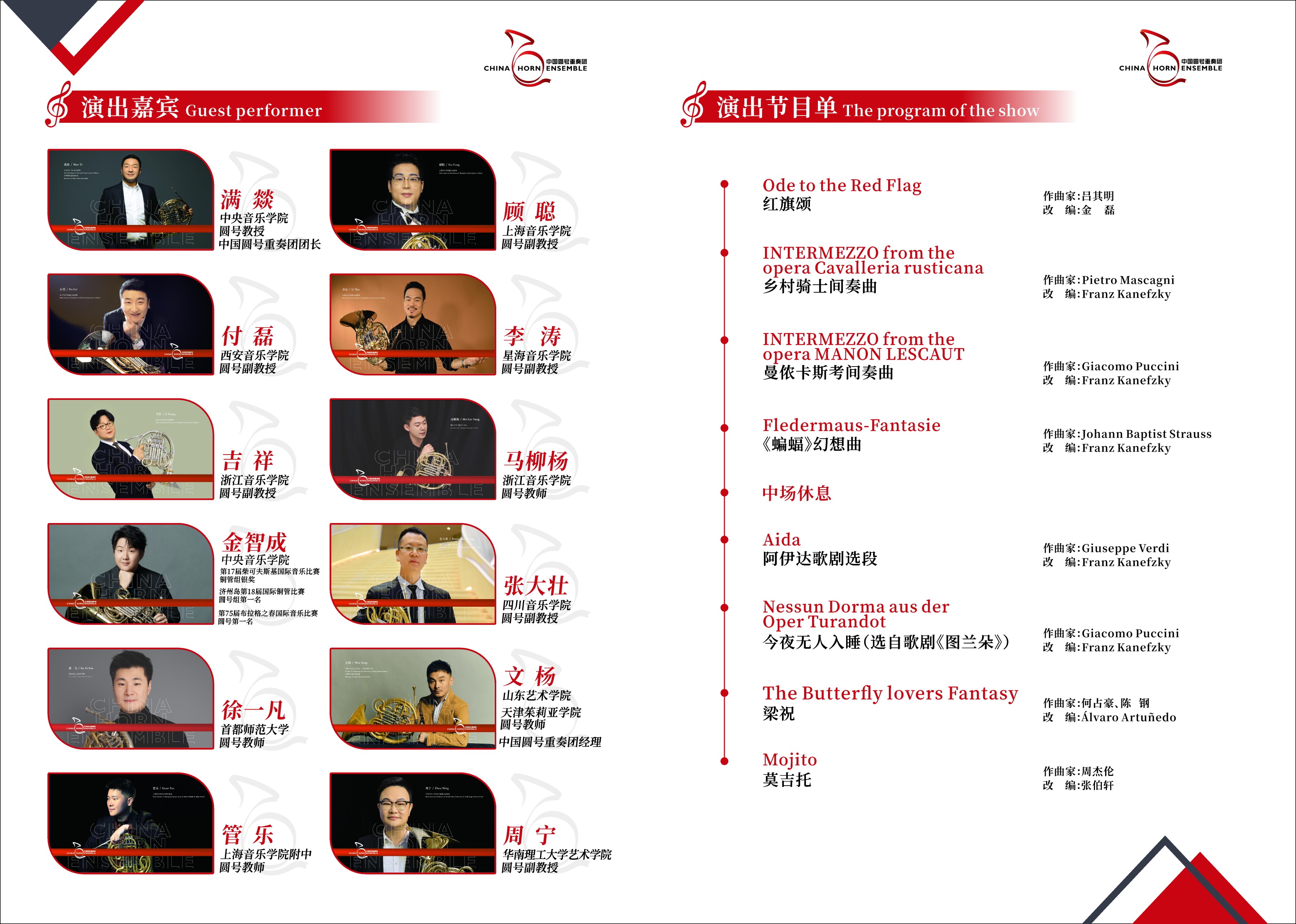 近年来,中国圆号事业发展迅速,华人圆号演奏家在国内外的舞台上越来越受瞩目。2015年,中国圆号重奏团(China Horn Ensemble)应运而生,由中央音乐学院圆号教师满燚发起, 并迅速引起海内外优秀华人圆号演奏家的共鸣。2015年秋天的北京,全球优秀的华人圆号演奏家怀抱着共同的理想,组成了这支活力四射的圆号重奏团。重奏团的成员除了国内一线音乐学府的圆号教授和老师,也囊括了享誉国际、任职国外一流乐团的首席圆号演奏家。这样的阵容不仅技艺精湛,充满朝气,也展现了中国圆号力量的凝聚力。自成立以来,已成为中国知名的室内乐团体之一。精致的艺术质感,温暖华丽的音色和充满新意的曲目编排,乃至每一位圆号艺术家的独特个性,都是中国圆号重奏团的标志。每一位音乐家都怀抱着对圆号的热爱与赤忱,在演出中倾 尽所有,他们的现场感染力和丰富的音乐内容,早已跨越了国家、跨越了语言,用音乐将这个世界紧紧相连。 音乐家们全力以赴挥洒魅力,乐迷朋友们津津乐道口口相传,灵魂的双向奔赴在一次次的演 出中不断打磨与升华,音符成为彼此最深沉的情感链接。