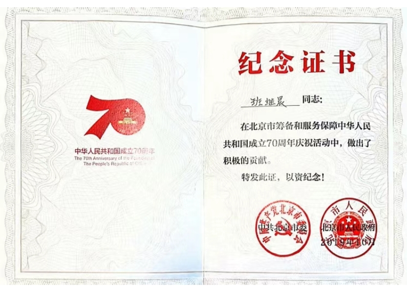 在北京市第八十中学读高中期间,班继晨加入了朝阳区青年志愿者团队,一直积极参与志愿活动。2019年,他随队参与新中国成立70周年庆祝活动的筹备和服务保障工作,深刻体会到志愿服务工作的重大意义,找到了自我价值。