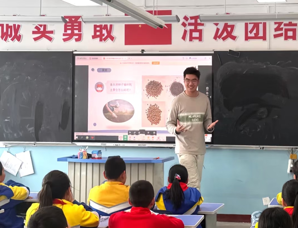 在学校,他给孩子们上科学课和体育课,用幽默风趣照亮课堂,将知识的种子播撒在孩子心田。孩子们都很喜欢他,亲切地称他为“班班老师”,稚嫩的童声为他的育人道路提供了满满的温暖。除了累计400小时的课堂教学外,他也协助学校开展安全管理,组织了校园隐患排查、地震演练等活动。